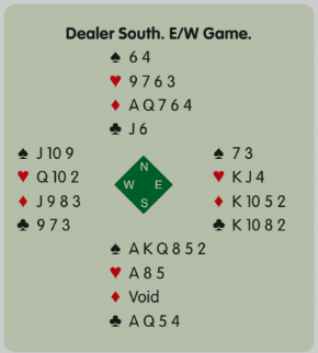 Hood soon spotted the play that was required. He won with the trump ace and then led the queen of clubs from his hand. William Cabot won with the king and returned a trump to declarer’s king. Hood crossed to dummy with the jack of clubs and discarded a heart on the ace of diamonds. A total of two clubs and a heart had to be lost, but the game was his.