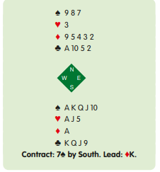 The play is simple if you focus on ruffing in the short hand. You have eleven top tricks and need just two ruffs. Take the red aces, ruff a heart, and come to hand with a trump, on which West shows out. Then ruff another heart, come to hand with a club, and finish drawing trumps. Your good clubs win the last three tricks. Eleven tricks become thirteen by ruffing twice in the short hand. Just one diamond ruff in the long hand and you would have lost control as East would have more trumps than you. Seldom will trumps break so badly, but you should avoid needless ruffs in the long hand.