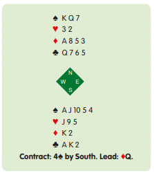 You count ten tricks on top and have a chance of an eleventh from your club suit. However, a 3–3 break is against the odds, so you would like a surer way of making an overtrick. Whenever you are looking for extra tricks, always consider ruffing in the short hand.